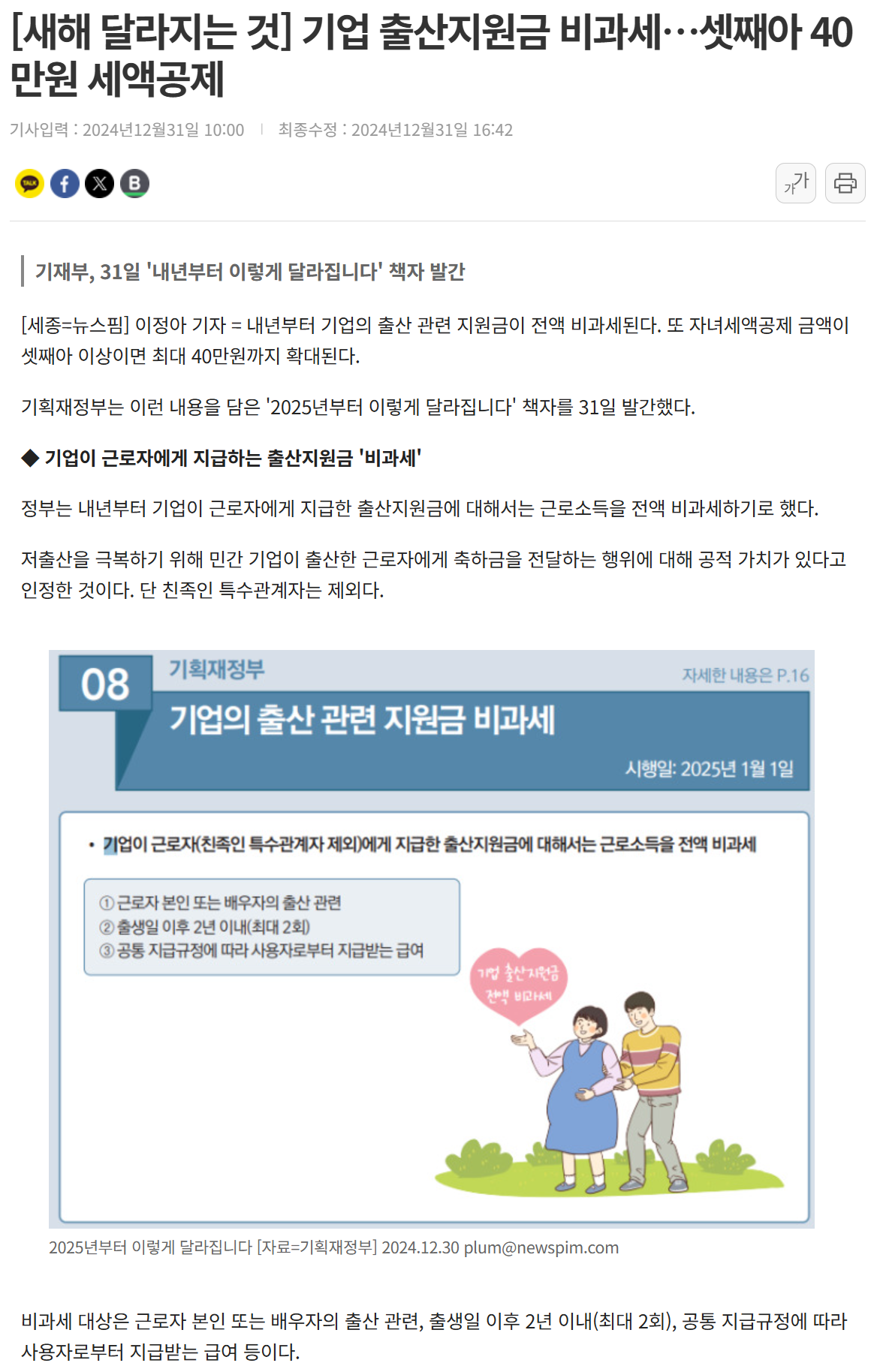 | 기업지원 | 출산지원금 비과세 | 회사 지급액 전액 비과세 | 근로소득 총액 제외 |